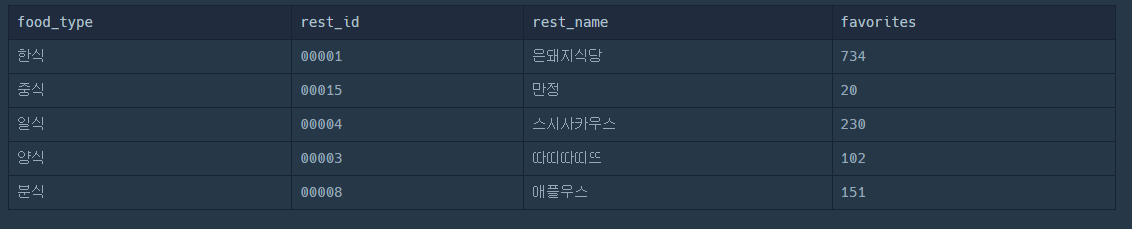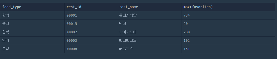 food_type 과 favorites 에는 각 음식종류와 가장 많은 즐겨찾기 수를 가지고 있는