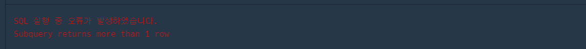서브쿼리에서 1개 이상의 값이 반환이 될때 발생하는 오류이다.
